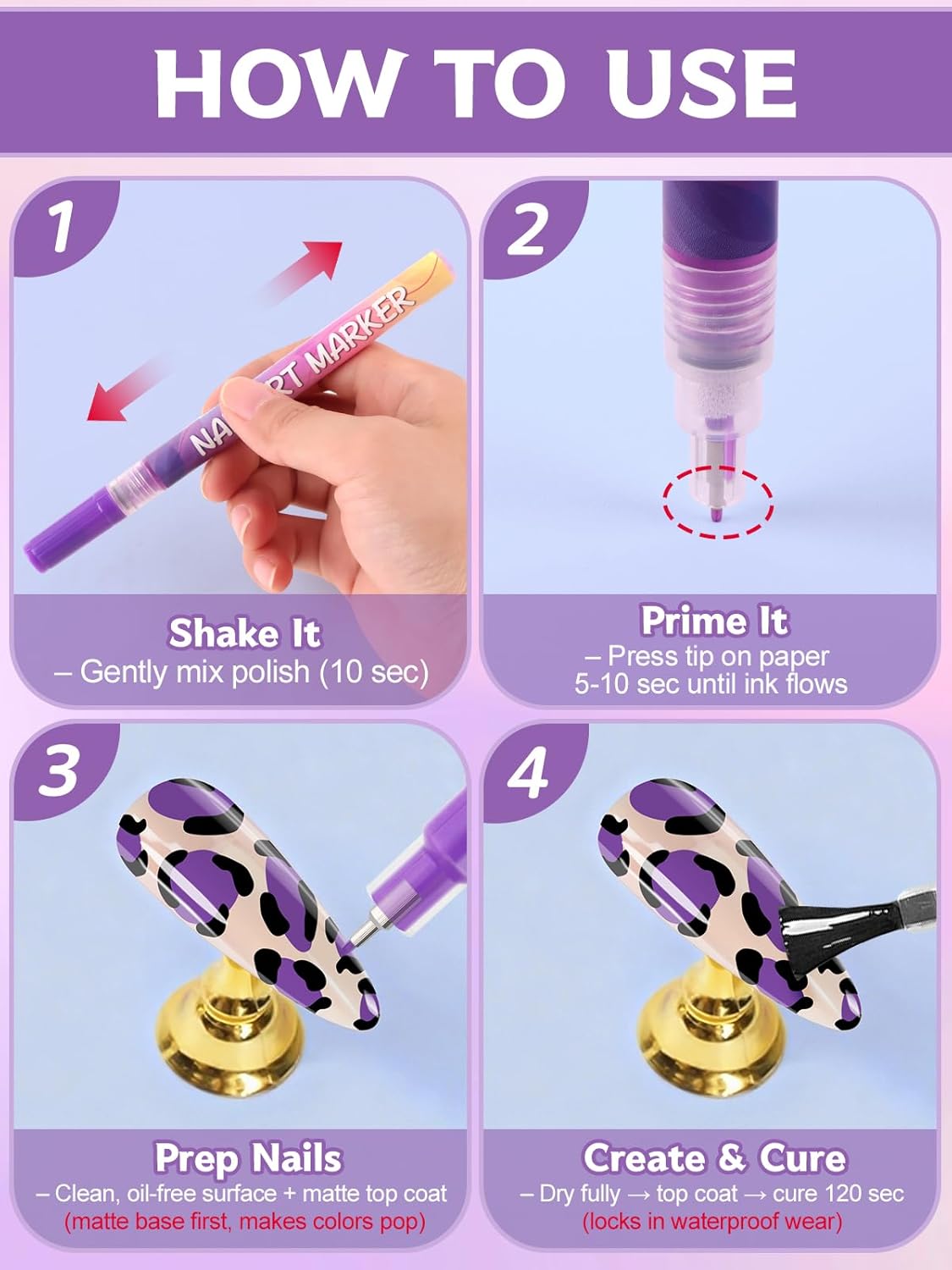 😍EASY TO USE FOR ALL SKILL LEVELS:These nail polish pens are ideal for both beginners and professional nail artists. The fine tip and smooth paint flow make intricate designs effortless. Simply shake the pen, press the tip to start the flow, and create stunning designs with ease.